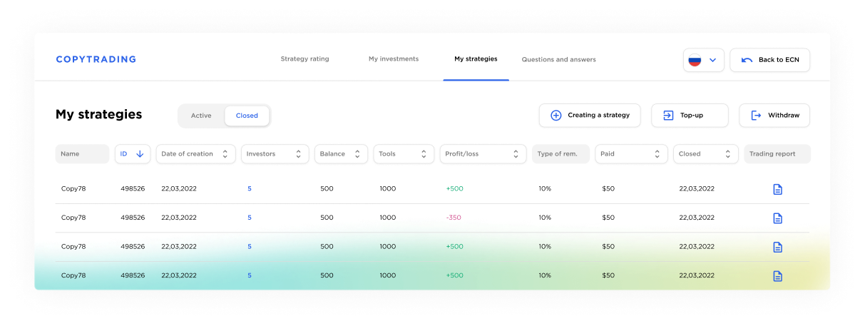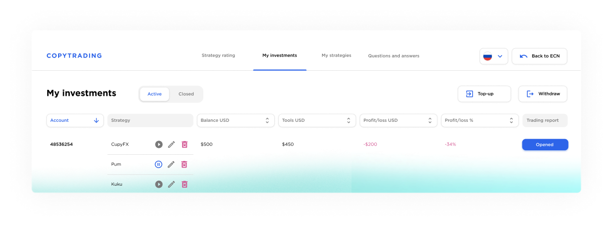 យើងផ្តល់អន្តរកម្មភ្លាមៗជាមួយអ្នកផ្តល់សាច់ប្រាក់ងាយស្រួលគ្រប់ទីកន្លែងក្នុងពិភពលោកដោយផ្ទាល់ ហើយពាណិជ្ជករធ្វើការសម្រេចចិត្តសំខាន់ៗរបស់ពួកគេផ្ទាល់ ឬធ្វើតាមយុទ្ធសាស្រ្តជោគជ័យដែលបានបញ្ជាក់។ នេះគឺជា ECN ពិត - និងជាឈ្មួញកណ្តាលពិតប្រាកដ។